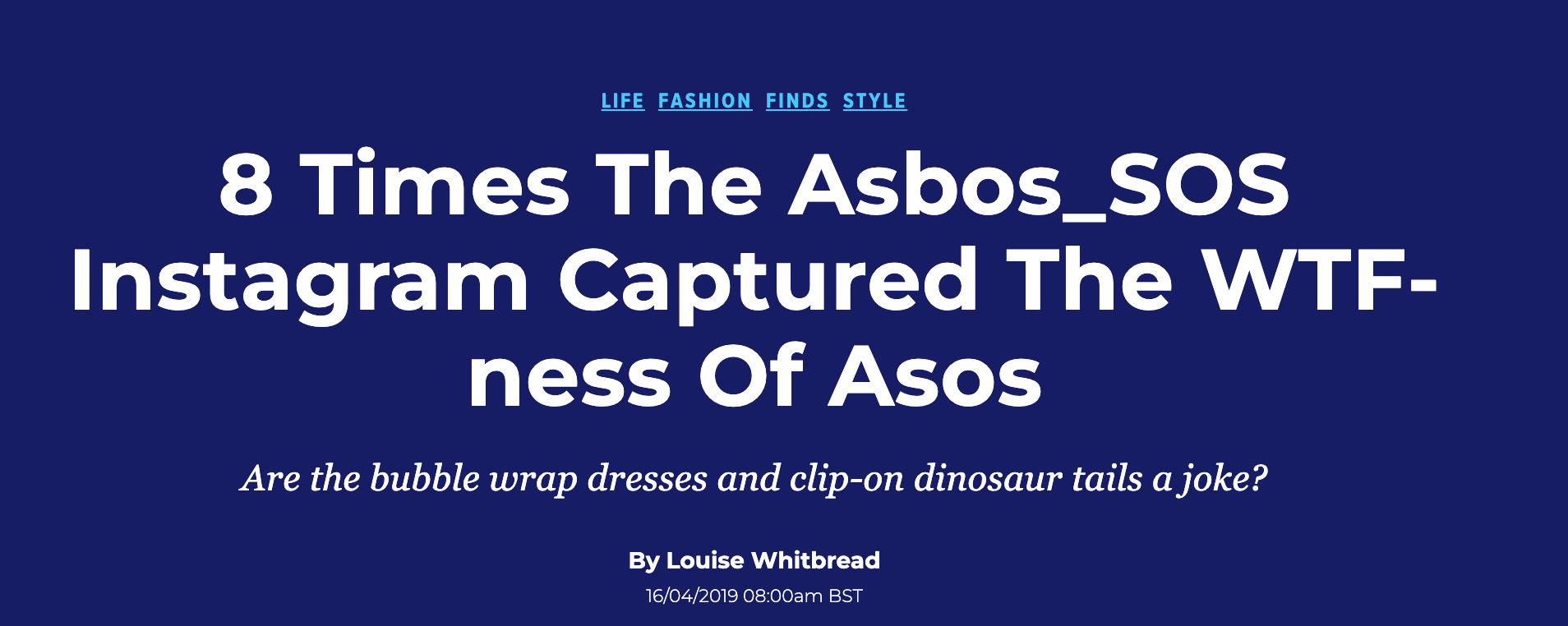 I am co-founder and writer of the famous ASOS parody instagram account - having a lol at the most ridiculous outfits on asos and providing weekly content for our favourite Tabloid’s fashion columns. Sadly since been shut down but had over 60k followers at its peak and was featured in The Huffington Post, The Guardian, and of course, The Sun sigh.